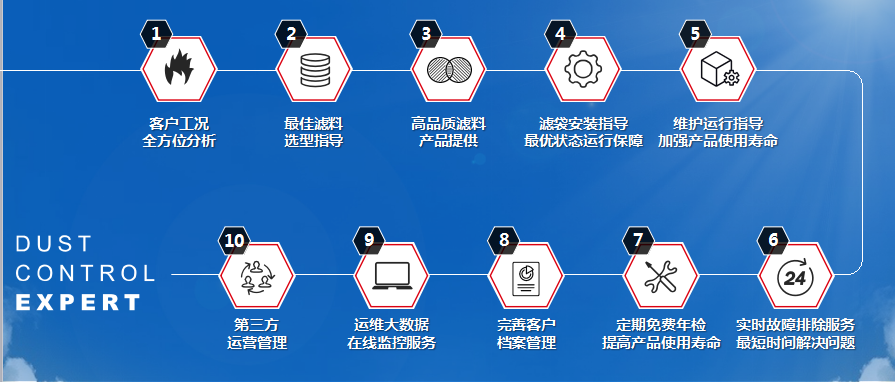 提供售前、售中、售后的全環(huán)節(jié)專業(yè)陪伴:客戶工況分析、合理濾料選型指導(dǎo)、高品質(zhì)濾料產(chǎn)品提供、濾袋安裝指導(dǎo)狀態(tài)運行保障、維護運行指導(dǎo)、實時故障排除、定期免費年檢、完善客戶檔案管理、運維大數(shù)據(jù)在線監(jiān)控及第三方運營管理服務(wù)。